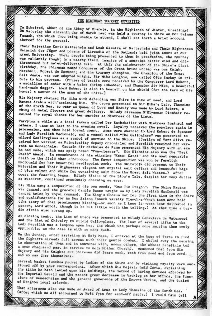 Thanks to Outlands Chronicler Kathryn of Iveragh and the Outlandish Herald, this account of the event is available. It's from the May, A.S. XIII issue of the Outlandish Herald. The account was written by Michael Gerard Curtmemoire.