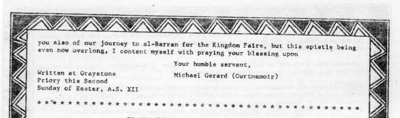 Meistres Rhonwen welcomes others who were there in the early days adding their reminiscences--after over 25 years, her memory is a bit faulty, and much information has disappeared in the fog. E-mail her at julia.west@REMOVETHIS.sff.net.