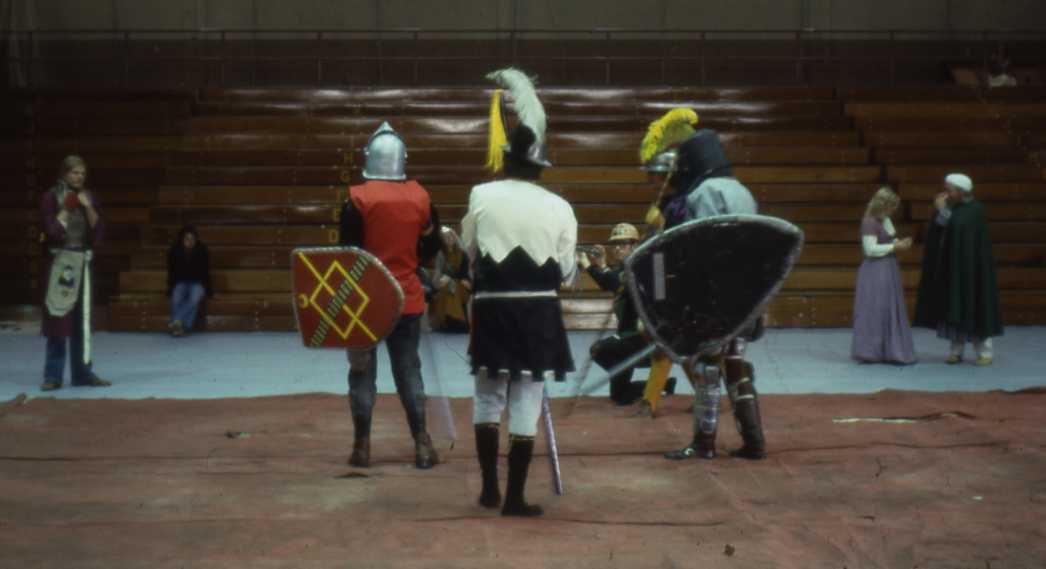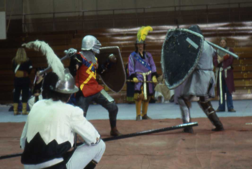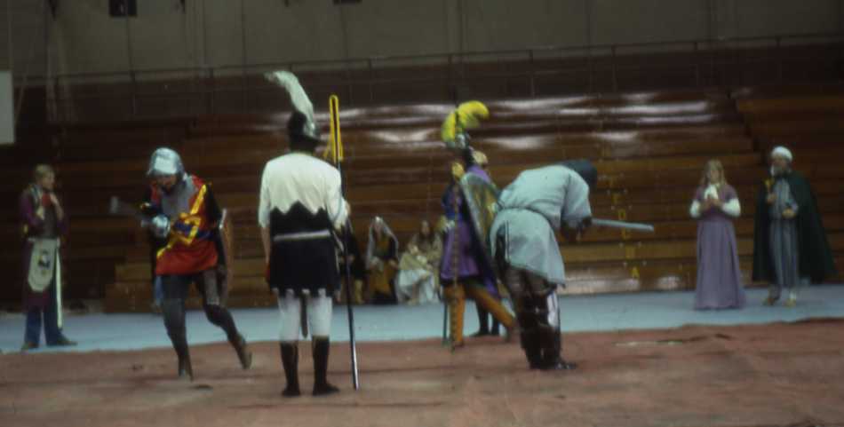 The tourney was held in a school gymnasium, and spectators sat on the bleachers. I remember that despite this very mundane location, the sheer pageantry of seeing a tourney like this for the first time was breathtaking.