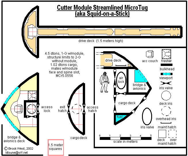 | Modular Scouts -- These are some deckplans I put together awhile ago for a JTAS (Journal of the Traveller's Aid Society) contest. JTAS is a website dedicated to Traveller, a science fiction role playing game. Please consider the Modular Scout deckplans a historical artifact as I will be redoing these deckplans and the color text in the near future as I have the tools to do a better job with them now. :-) | ||